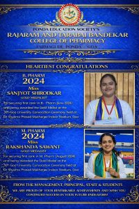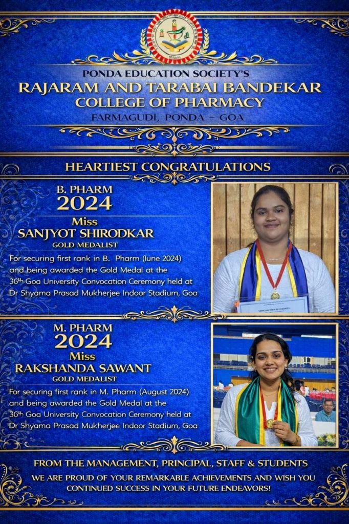 Congratualtions Ms. Sanjyot Shirodkar (B.Pharm) and Ms. Rakshanda Sawant (M.Pharm) for bagging Gold Medal at Goa University for the year 2024